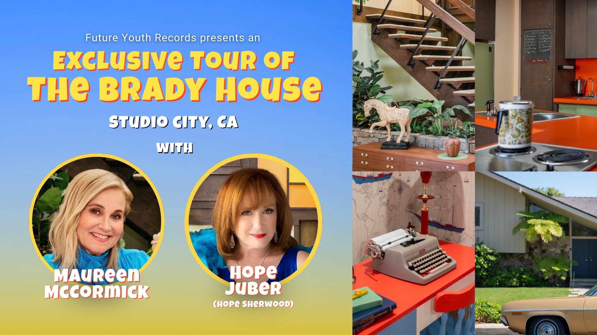 Hope Juber, daughter of Brady Bunch creator Sherwood Schwartz, guides your private tour of the iconic Studio City house. Enjoy a light brunch, then sit down with Maureen McCormick, Marcia Brady herself, for a private meet and greet.